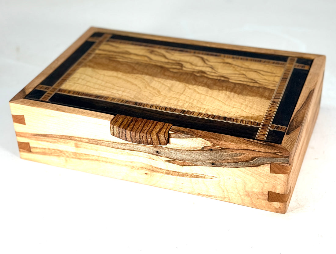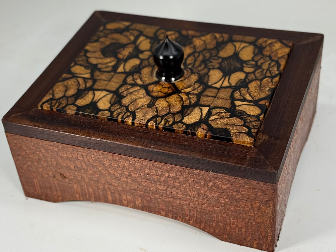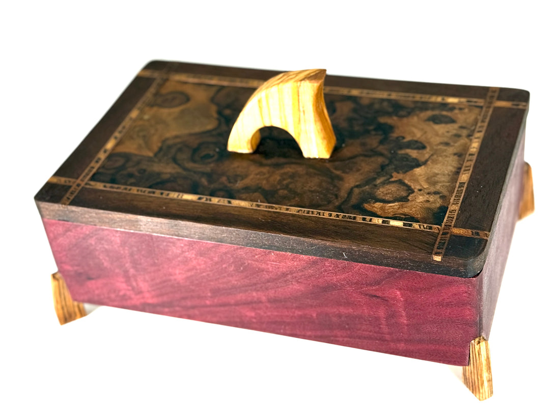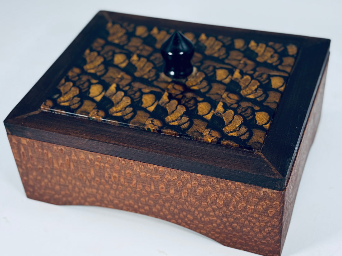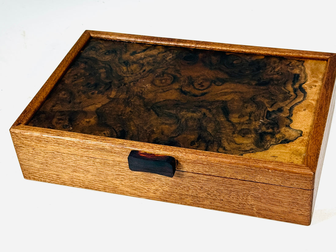 husband loves it! We have a cousin who builds musical instruments, and when he saw the wood he was most impressed and took your card.It may be just a box, but it’s a work of art and I’m happy my husband has a place for his things. A place he lost in our fire.Thank you!