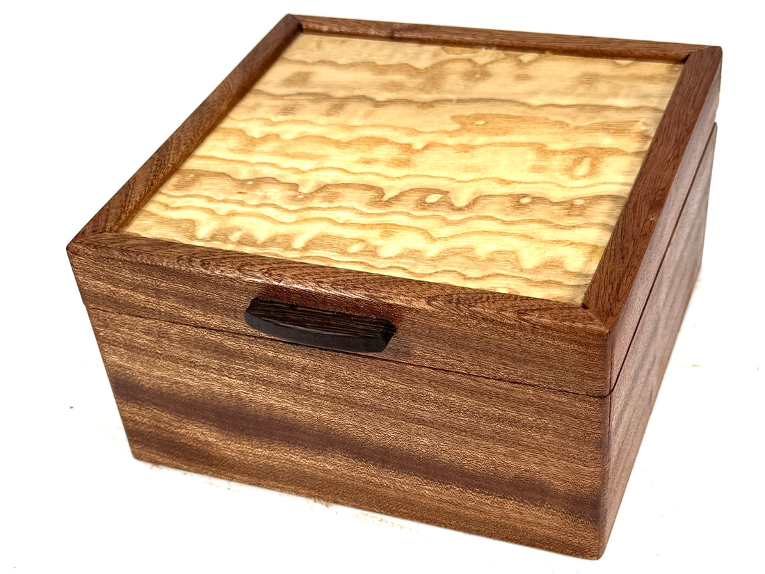 This compact tea box is made from ambrosia maple. The joinery features walnut dovetail splines...