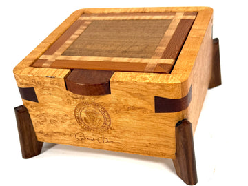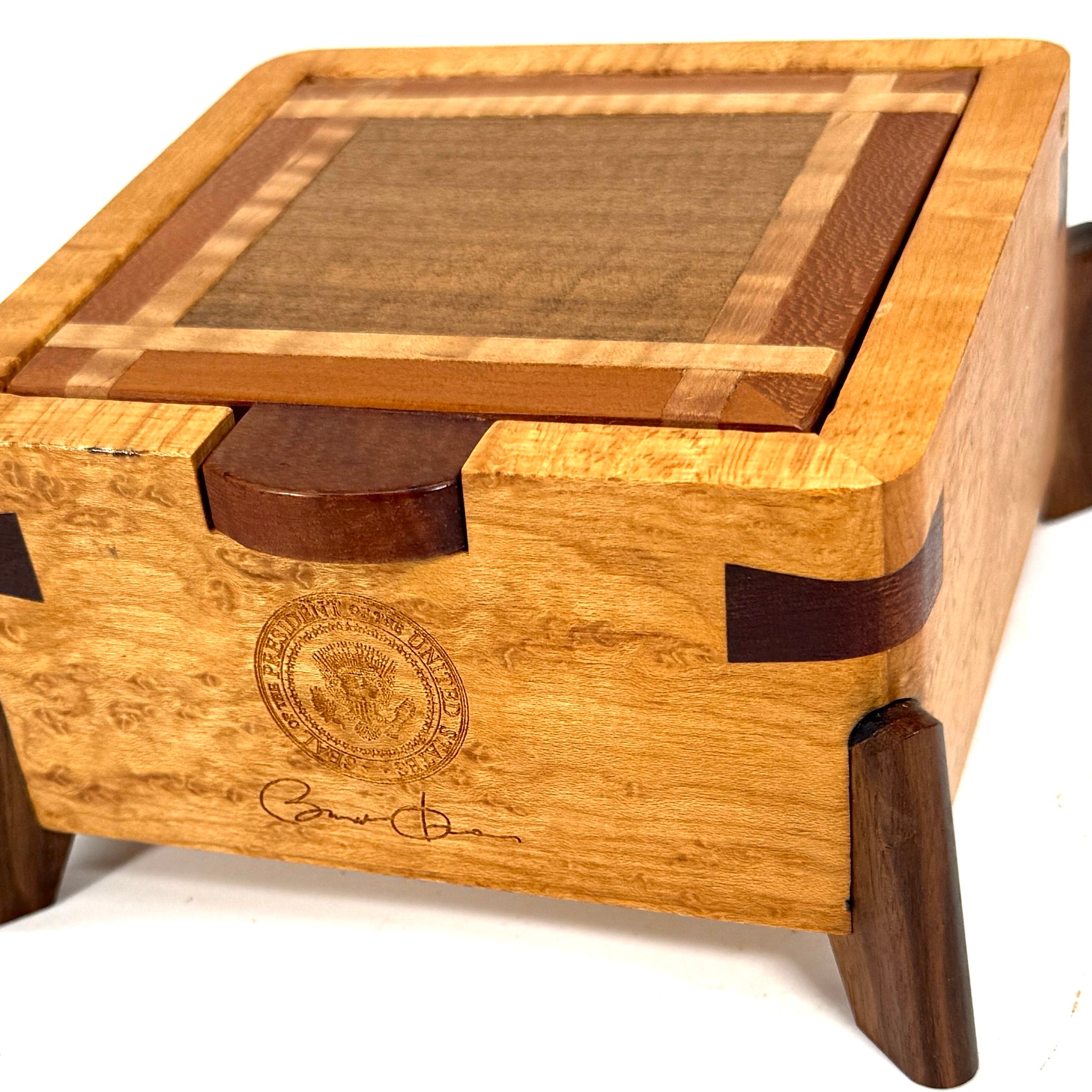 That voyage became the foundation for Boudreau’s artistic practice. Settling in South Florida, he began crafting finely made wooden boxes using the stunning woods collected during their global journey. From richly grained African padauk to silky Hawaiian koa, Boudreau works exclusively with natural materials, no stains or dyes, letting the wood’s inherent beauty speak for itself. In 2011, his craftsmanship caught the eye of the U.S. State Department, which commissioned him to create cuff link boxes for Presidential gifts to foreign dignitaries.