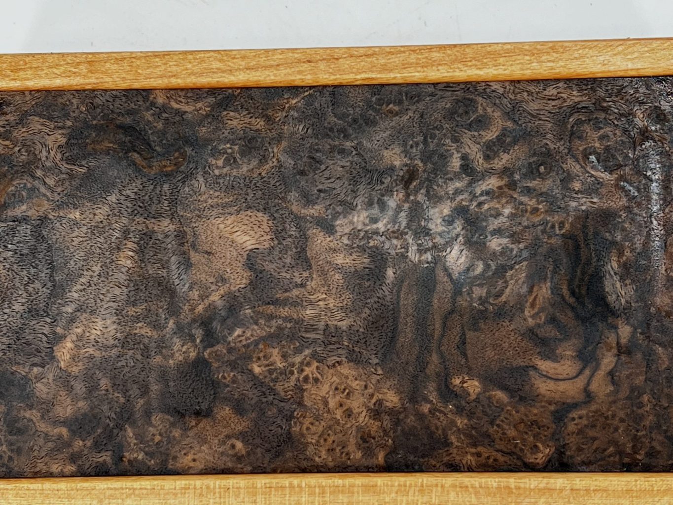 This handsome valet box is made from cherry with wenge splines at the mitered corners.. The top is a veneered panel of a walnut burl. The lift tab is wenge. The box bottom is lined with espresso pigskin.