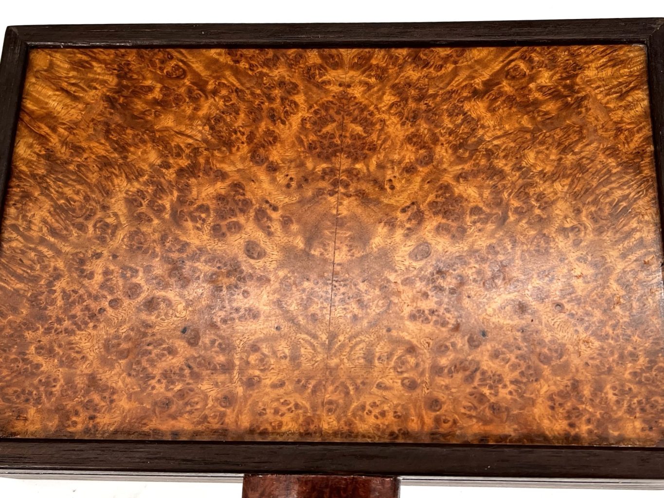 This handsome valet box is made from peruvian walnut. The top is a veneered panel of amboyna burl. The lift tab is amboyna burl. The box bottom is lined with espresso pigskin. The lid is attached with a unique all wood hinge.