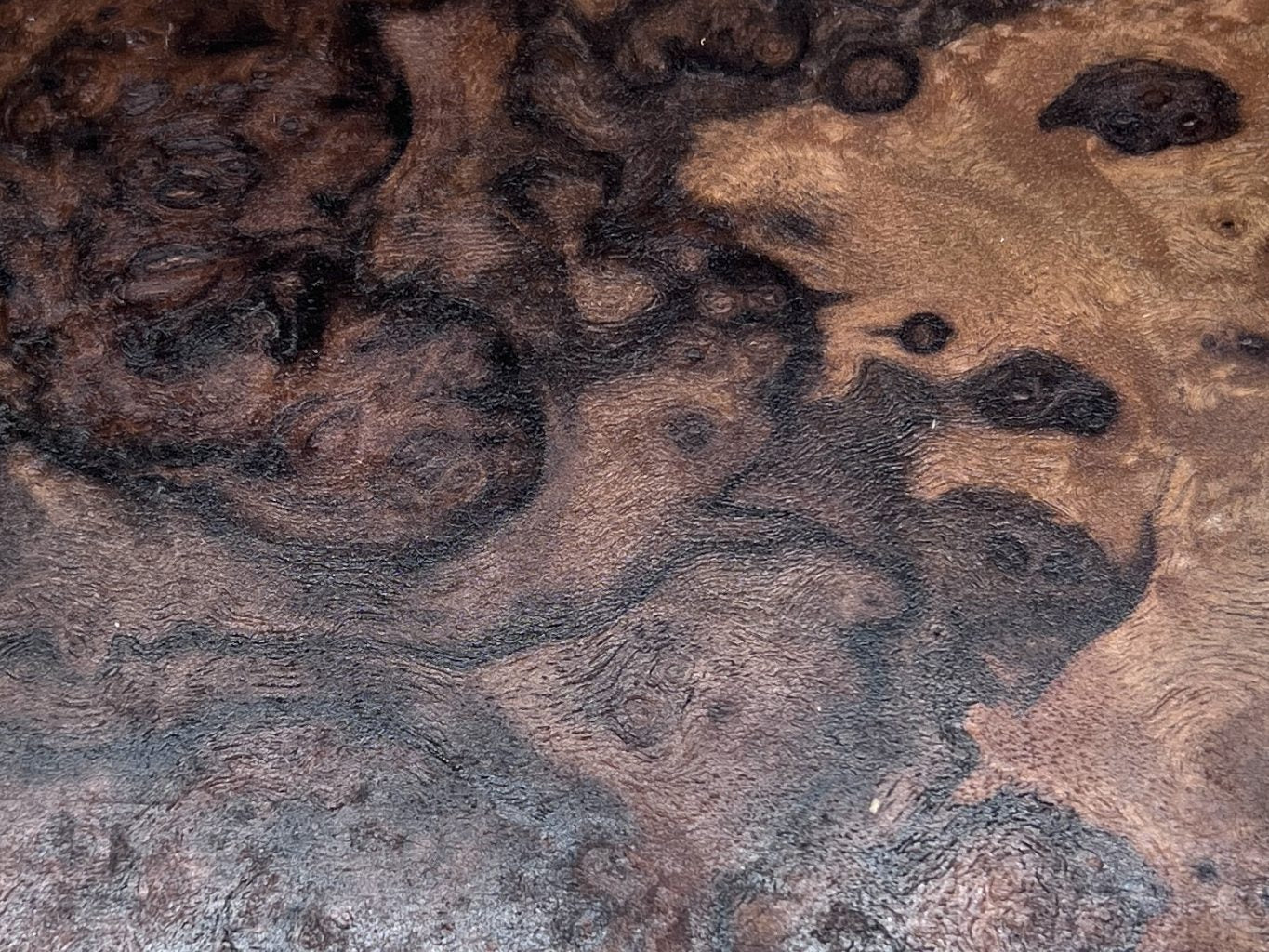 This handsome valet box is made from Brazilian yellowheart with wenge splines at the mitered corners.. The top is a veneered panel of a walnut burl. The lift tab is wenge. The box bottom is lined with espresso pigskin.