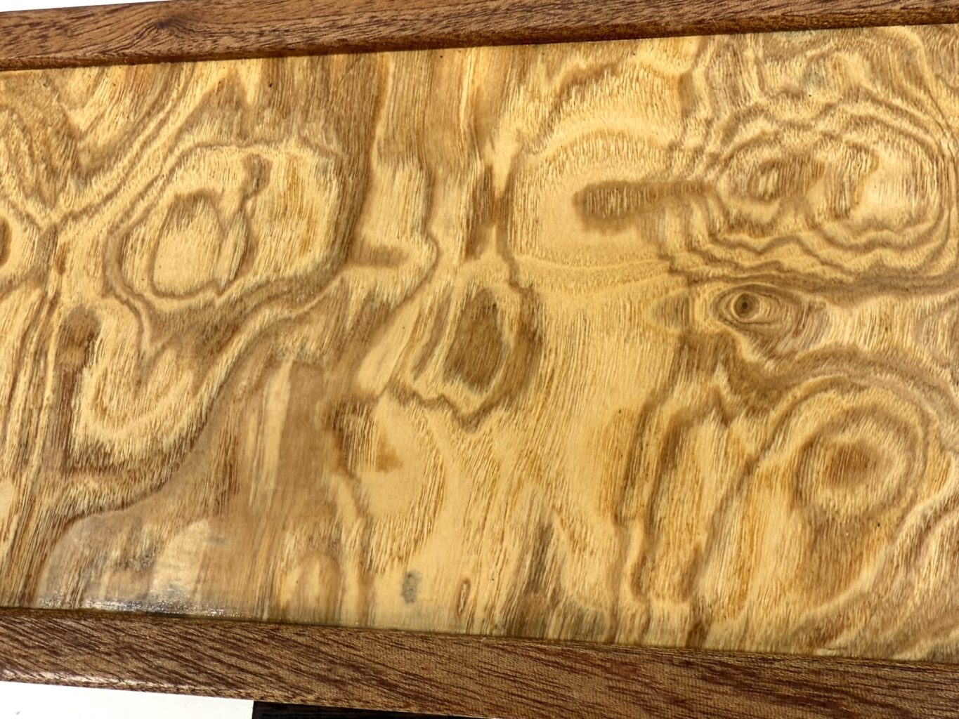 This handsome valet box is made from African sapele with wenge splines at the mitered corners. The top is a veneered panel of oliove ash burl. The lift tab is wemge. The box bottom is lined with rust pigskin.