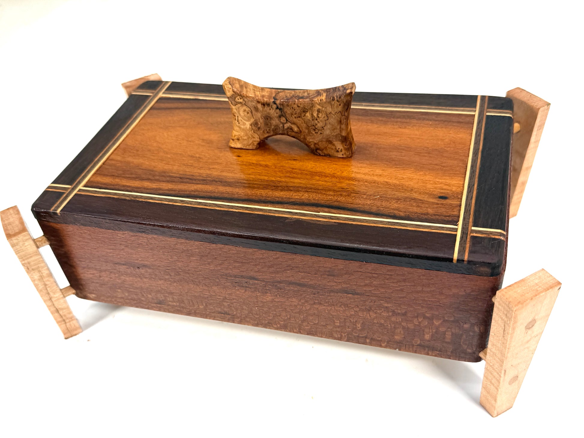 This unique box is made of South American leopardwood with scurly maple "outrigger" legs suspended by maple pegs at the mitered corners.The top is an Bolivian rosewood veneered panel in a Peruvian walnut frame.The top panel has a border inlay ofmaple, walnut and cherry.