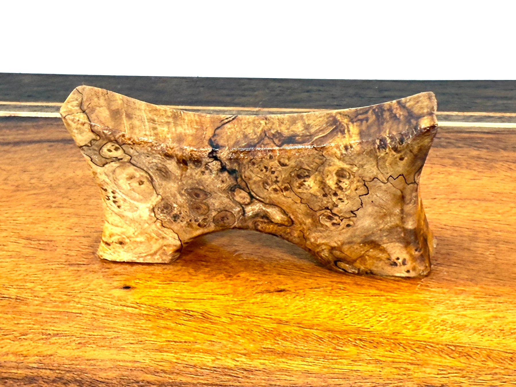 It has a hand carved maple burl handle. This floating box design was inspired by the Polynesian canoes we observed on our "Around the world Sailing Adventure".