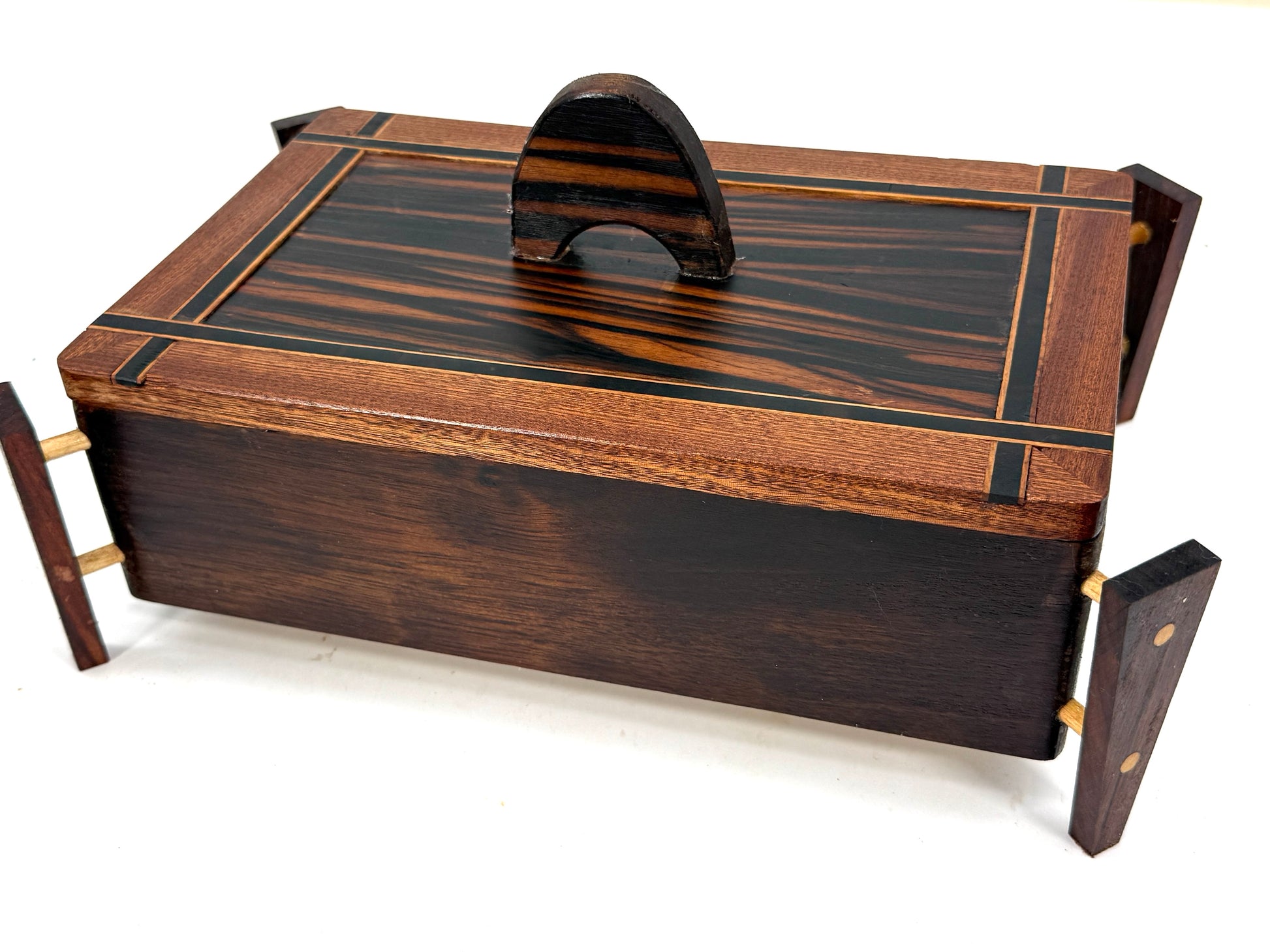 This unique box is made of Peruvian walnut with morado "outrigger" legs suspended by maple dowels at the mitered corners.The top is a macassar ebony veneered panel in a sapele frame.The top panel has a border inlay of macassar ebony and cherry.