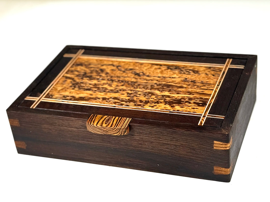 husband loves it! We have a cousin who builds musical instruments, and when he saw the wood he was most impressed and took your card.It may be just a box, but it’s a work of art and I’m happy my husband has a place for his things. A place he lost in our fire.Thank you!